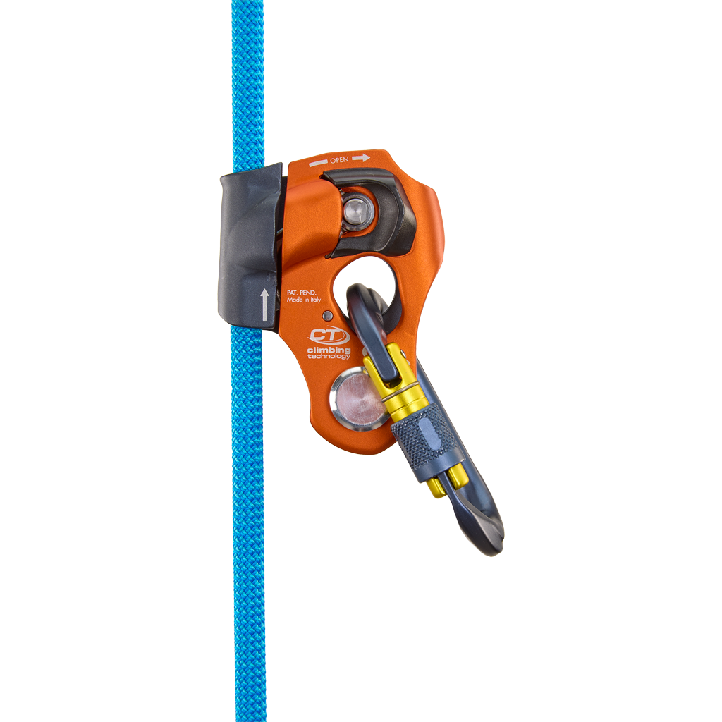 ° l’ouverture ergonomique au moyen d’un bouton intuitif permet une installation rapide sur la corde dans le mode souhaité même en portant des gants ou dans des conditions défavorables ;